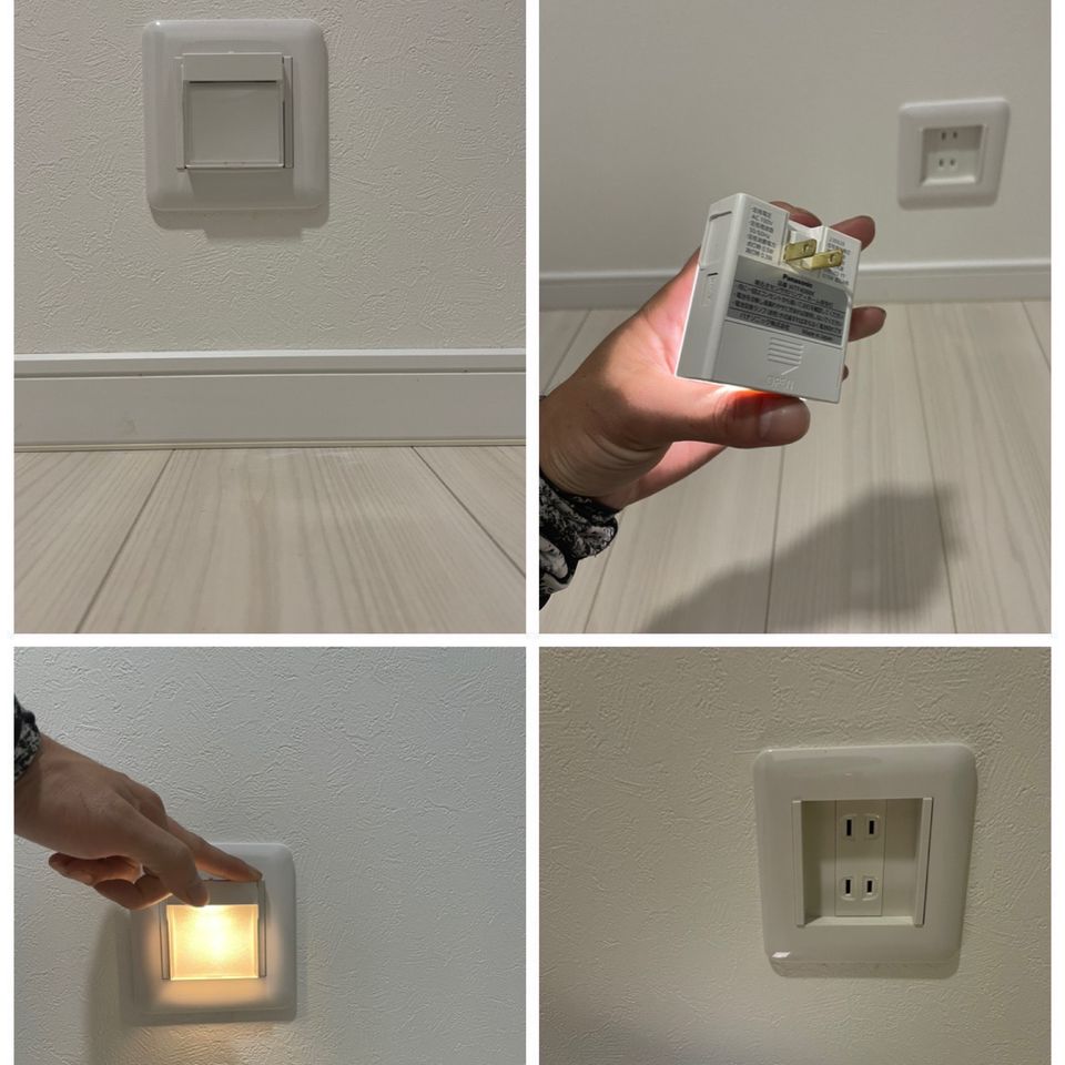 コンセント充電され、取り外すとコンセントが使用でき、さらに非常灯として持ち歩きもできますので、
